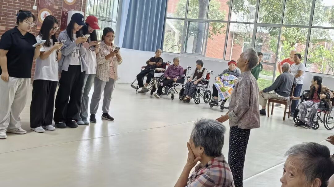 活动伊始,20 余名志愿者带着精心筹备的手工材料、游戏道具与慰问品准时抵达养老中心。在与养老中心工作人员简单对接分工后,大家迅速进入服务状态,文艺表演环节率先登场:志愿者们分组登台献艺,《小美满》的温柔旋律缓缓流淌,勾勒出岁月静好的幸福图景;《桃花朵朵开》的欢快节奏一响起,现场氛围瞬间被点燃,不少老人跟着节拍轻轻点头;《歌唱祖国》的激昂曲调唤起老人们深埋心底的家国记忆,有老人忍不住轻声跟唱;《但愿人长久》以悠扬唱腔,传递出对老人们健康长寿的美好祝愿。全程掌声与笑声交织,老人们的脸上始终洋溢着欣慰的笑意。