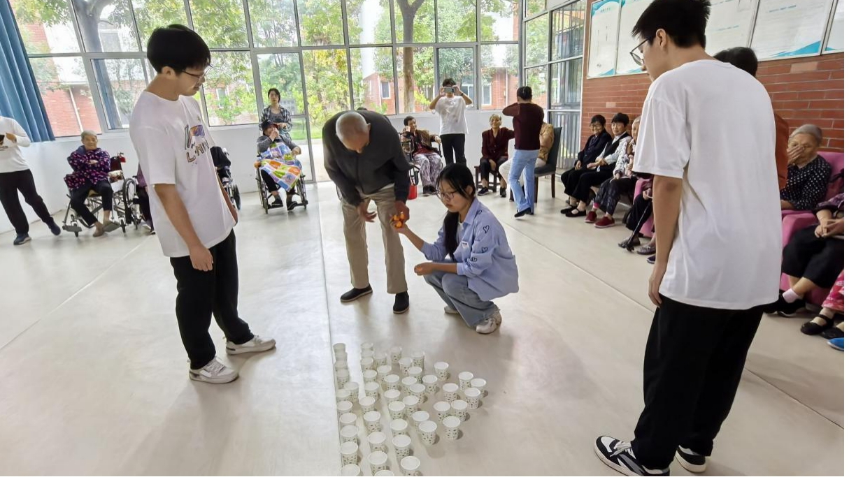 文艺表演结束后,活动转入互动体验环节。手工区内,志愿者们围在老人身边,手把手指导扭扭棒制作 —— 从最初拿起扭扭棒时的手忙脚乱,到逐渐掌握技巧后的熟练操作,老人们全神贯注投入其中,当一朵朵色彩鲜艳的 “鲜花”、一个个灵动的小摆件在手中成型时,老人们纷纷举起作品向身边人展示,眼中满是自豪与成就感。游戏区则精心设置了筷子传杯、投乒乓球、套圈三个适合老人参与的项目:志愿者耐心讲解规则,还亲自示范动作;面对行动不便的老人,大家主动搬来座椅,贴心协助其参与;每当有老人在游戏中获胜,接过礼品奖励时,脸上都会绽放出灿烂的笑容。此外,部分志愿者还特意留在休息区,或陪老人唠家常、听老人讲述过往故事,或与老人玩简单的互动小游戏,用陪伴驱散老人的孤独。