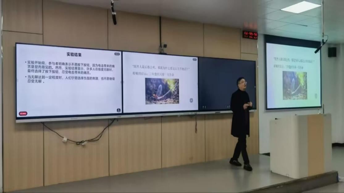“若把你关在 10 平米房间 30 分钟,身边只有一个会产生轻微电击的按钮,你会选无聊静坐,还是按下按钮?” 讲座刚开篇,李教授抛出的 “无聊电击实验”,瞬间点燃全场注意力。当他揭晓 “多数人宁愿忍受轻微疼痛,也不愿直面极致无聊” 的实验结论时,台下学子纷纷颔首 —— 这一结果精准戳中了当代青年常陷入的 “意义真空”:看似被学业、社团填满的生活,却偶尔会在深夜追问 “我在忙什么”,这种迷茫比单纯的忙碌更磨人。