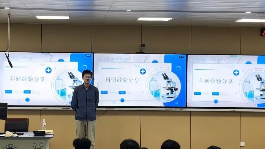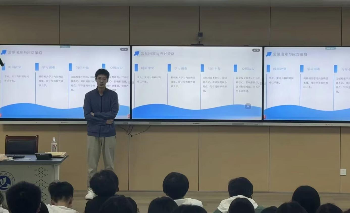 分享会的最后,主讲人陈阳阳坦诚分享科研路上的荆棘坎坷,谈到学业与科研时间难以协调、科研知识晦涩难懂等重重困难,他倾囊相授应对之策,鼓励同学们保持积极乐观的心态,转换视角看待挫折,从失败中汲取养分,在压力下重塑自我,奋力突破科研瓶颈。