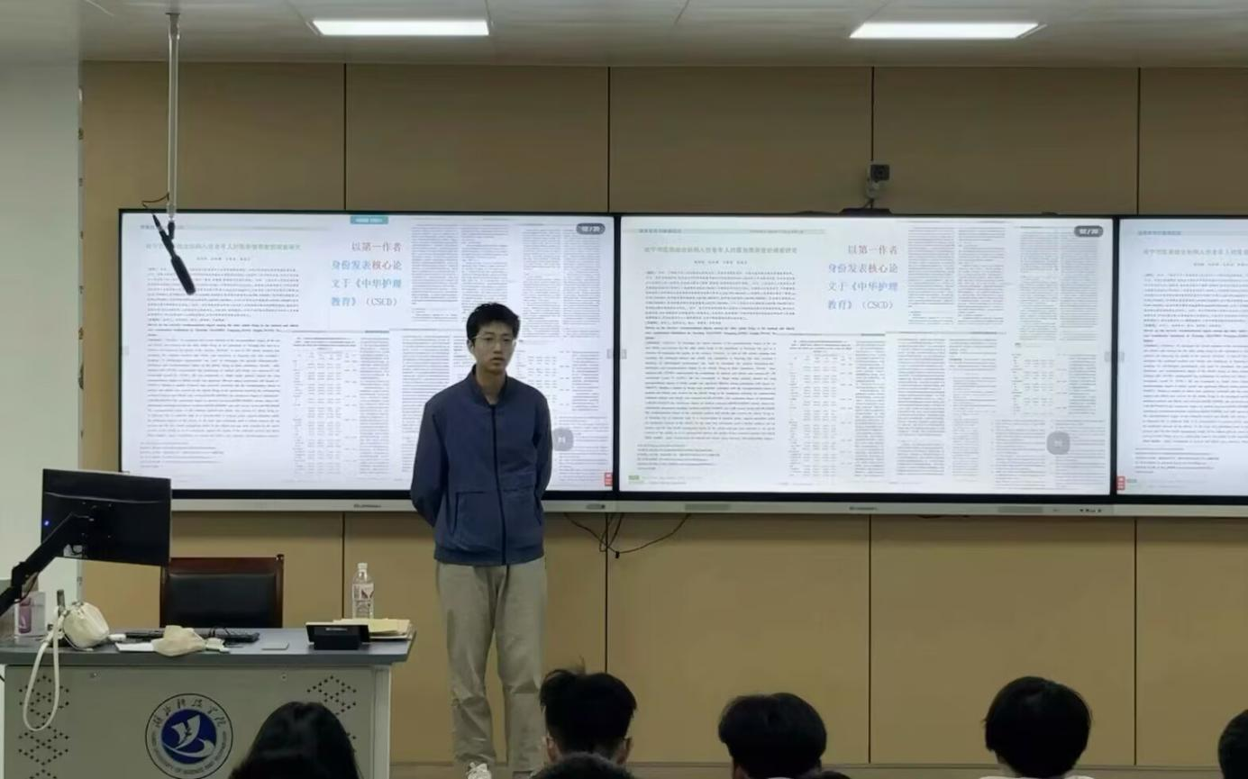 分享会开场,主讲人陈阳阳展示了他以第一作者身份发表于权威期刊《中华护理教育》的核心论文,瞬间聚焦全场目光。他从多个维度向同学们细致分析了国内外期刊在学术影响力上的差异,呼吁同学们积极投身研究,发表更具影响力的科研文献,勇攀学术高峰。