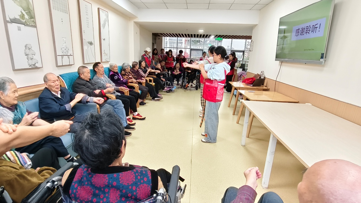 活动以一场贴近老人需求的健康宣讲拉开帷幕。志愿者主讲人陈梓甜结合公共卫生专业特色,提前梳理老年群体常见健康痛点,通过图文并茂的 PPT 和生动动画视频,围绕 “秋冬养生锻炼”“居家安全防护”“情绪调节与乐观心态” 三大核心内容展开讲解。讲解养生操时,她特意放慢动作,手把手指导老人们活动肩颈、转动手腕,还邀请几位老人上台示范,现场氛围轻松活跃;提及居家安全,她用 一些具体案例,搭配漫画图示,让老人们快速理解;互动环节中,面对老人提出的 “关节疼如何缓解” 等问题,陈梓甜结合专业知识耐心解答,还主动留下联系方式,方便老人后续咨询,其专业与热情赢得老人们阵阵掌声。