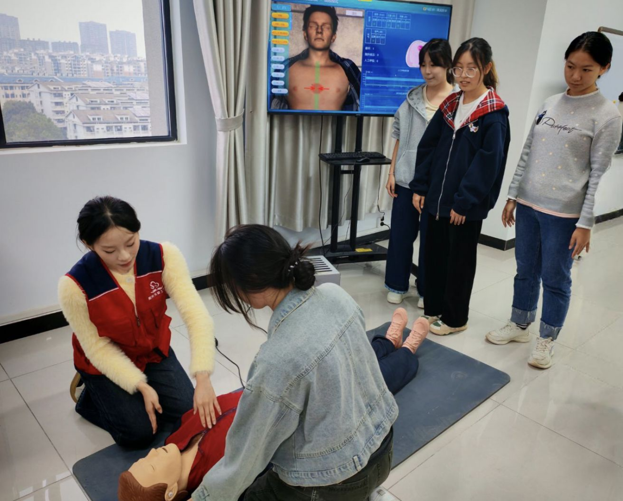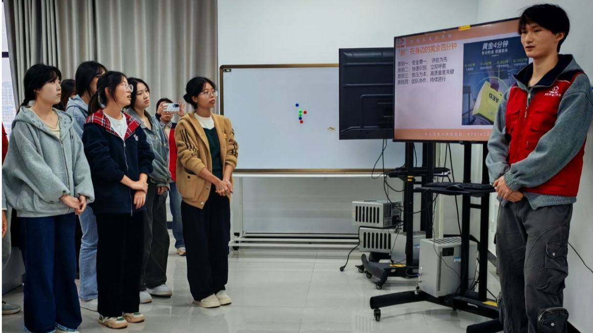 培训内容紧密贴合校园常见应急场景,以 CPR AED 协同施救” 为核心展开。讲师团队围绕心跳呼吸骤停的快速识别方法、“黄金 4 分钟” 救援时间窗的重要性、胸外按压标准、人工呼吸操作要点等关键知识模块进行细致讲解,既帮助学员夯实急救理论基础,又引导大家理解急救操作背后的医学原理,为后续实操训练做好充分铺垫。