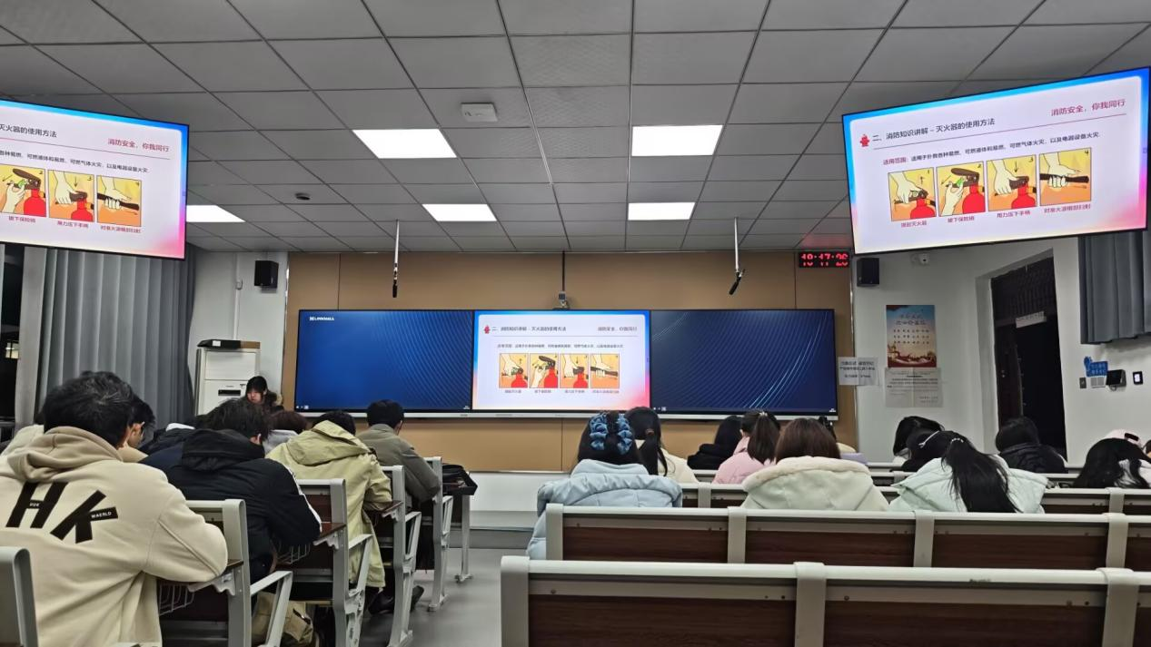 在消防知识讲解与技能传授环节,各班聚焦实用性与可操作性,向同学们普及了关键消防技能与逃生技巧。不仅详细拆解了灭火器 “提、拔、握、压” 的使用口诀,演示了消火栓的正确操作方法,还深入阐释了火场逃生的核心原则 —— 保持镇静不慌乱、湿毛巾捂紧口鼻、低姿弯腰沿墙疏散、坚决不乘电梯、切勿贪恋财物等,同时明确了无法及时逃生时固守待援的防烟自救措施。此外,各班还针对不同场景强调了火灾预防要点:宿舍需严格做到人走电断,严禁使用明火与违规电器;实验室要严守操作规程,规范管理化学品;公共区域需自觉维护消防通道畅通,共同杜绝安全隐患。通过系统讲解,同学们基本掌握了 “会排查、会报警、会灭火、会逃生” 的消防安全必备能力。