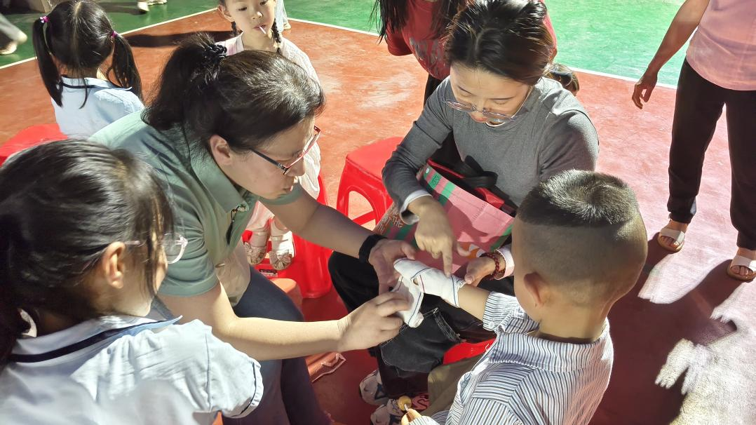知识讲解结束后,437必赢会员中心,437必赢会员中心的阎老师带领工作人员们进行现场包扎演示。利用医用纱布和绷带,工作人员向现场的小朋友和家长们展示了正确的包扎方法。"包扎时要绕过大拇指,整体呈‘8’字绕法。"阎老师一边解说,一边在小朋友的手上进行操作。孩子们对此十分感兴趣,学会之后还在同伴的手上进行试验。