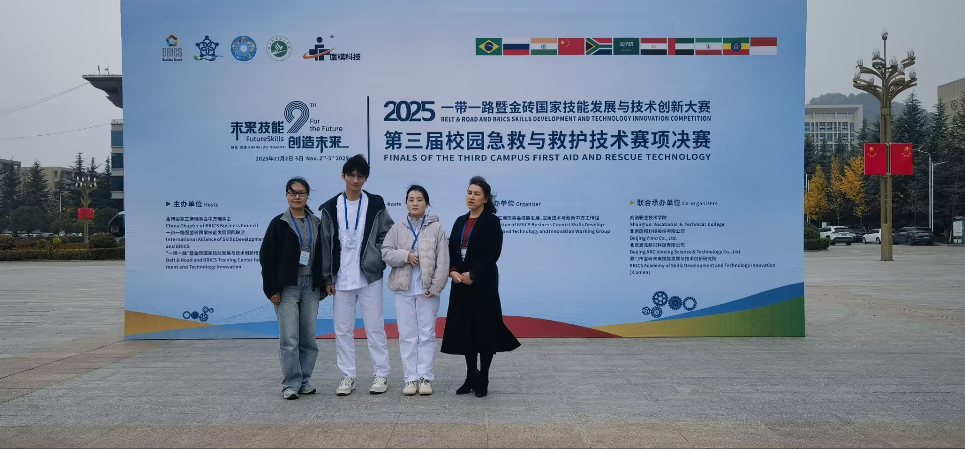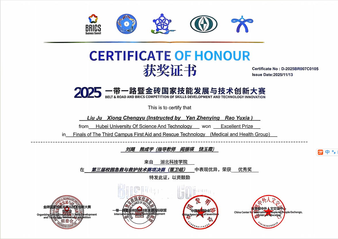 1152025一带一路暨金砖国家技能发展与技术创新大赛第三届校园急救与救护技术赛项决赛在商洛职业技术学院圆满落幕。437必赢会员中心,437必赢会员中心学子刘飓、熊成宇在饶玉霞、阎振瑛两位老师的悉心指导下,凭借扎实的专业技能与稳定的现场发挥,从众多参赛选手中脱颖而出,荣获该赛事医卫组优秀奖,为学校与学院赢得荣誉。